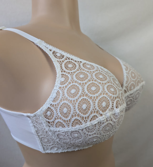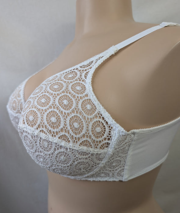 This full cup bra showcases Chantelle’s signature craftsmanship with its unique circular lace pattern and seamed underwire cups that shape and lift without padding.