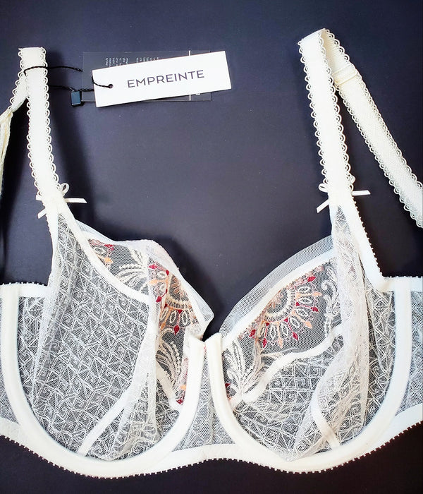 A striking Empreinte bra, Victoria, in a balconette style. This well designed and fashionable bra has three part cups with a low cut for a sensuous look if you prefer. Made from a tulle fabric, this bra gives you strong support and a great lift. Empreinte bras are exquisitely crafted and always in high demand, having this Empreinte bra on sale makes it even more appealing.