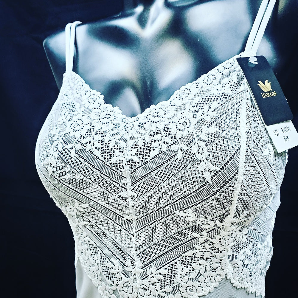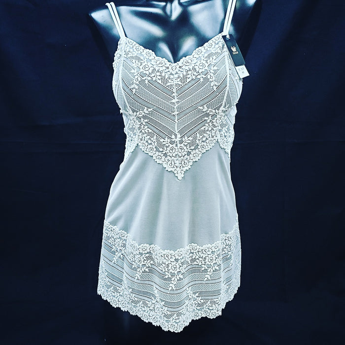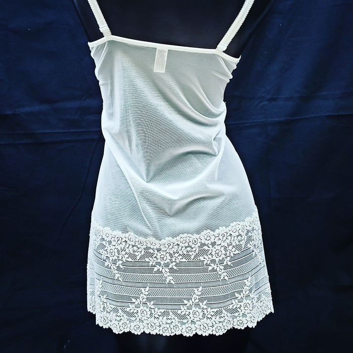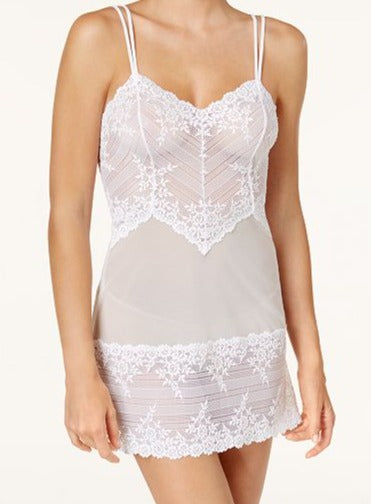 This chemise by Wacoal, Embrace Lace (814191), can easily become one of your favorite wardrobe pieces. Highly versatile, use her around the house or for bed. She can be layered below your outfit. A mesh body with lace trim and a little stretch in her. Color White. Style 814191.