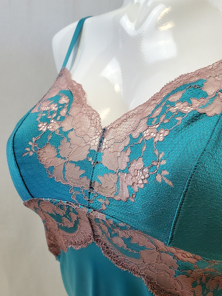 This chemise has a lot going for her, but we love the color. Lace Affair (812256) from Wacoal, made of a silky microfibre this chemise is comfortable, soft, and feminine. Lace below and around the cups adds sophistication. You can sleep in her, wear her around the house or layer her under your clothes. Color Pagoda Twilight. Style 812256.