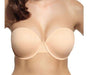 A strapless bra by Panache, Porcelain, with smooth and seamless cups. A lightly padded bra with molded cups, it offers a round shape and a plunge neckline. Silicone grippers along the wings help secure the bra. It has adjustable straps that can be worn halter, one-shoulder, criss-cross, or regular.