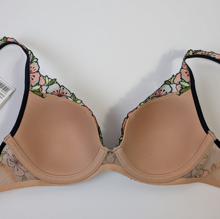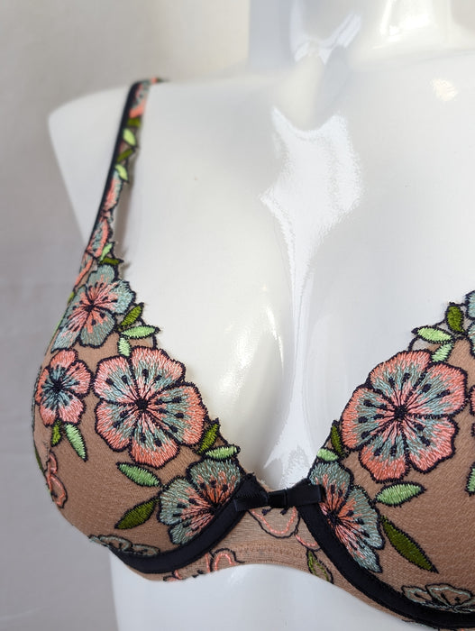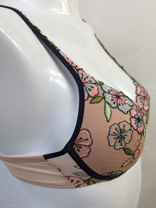 Adorned with vibrant floral embroidery on sturdy tulle, this modern padded bra exudes elegance. Its semi-adjustable, convertible straps offer versatility, while the underwire cup provides shaping.
