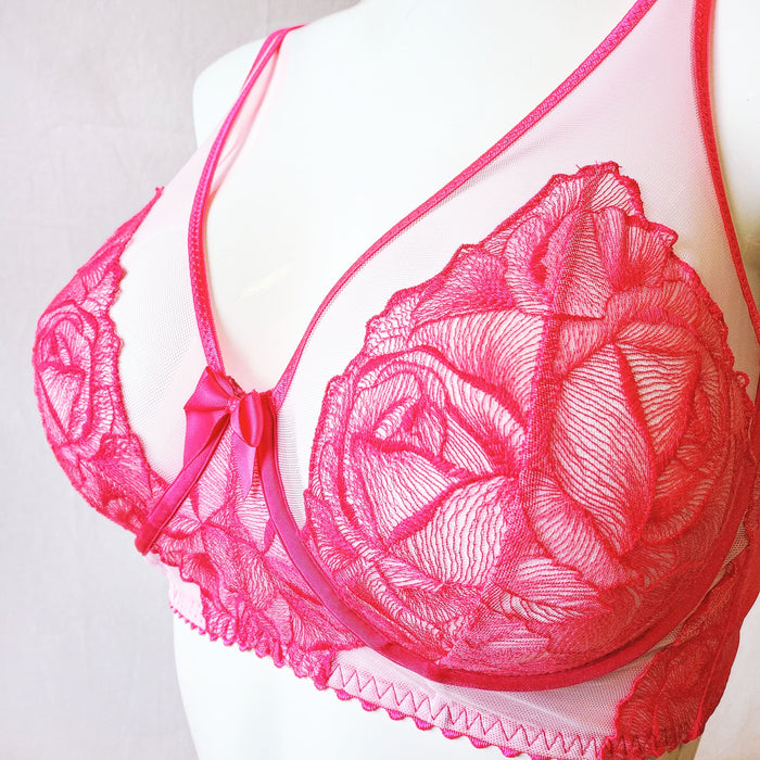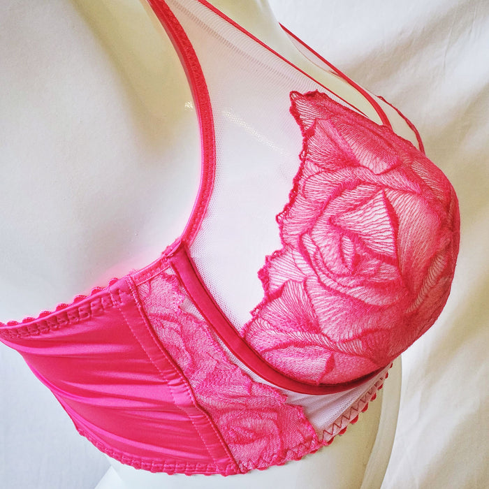 The eye-catching design includes non-padded deep plunge cups supported with an underwire.