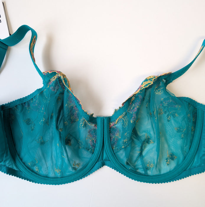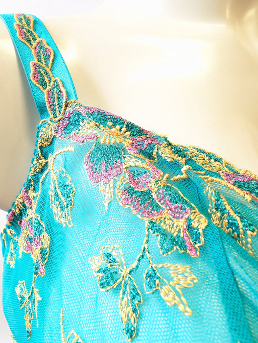 The underwired cups are reinforced with tulle for structured support, while the balcony cut enhances a lifted, rounded shape.