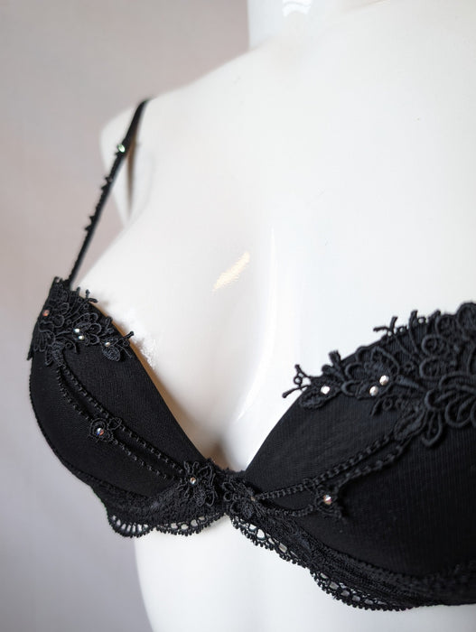 This bra has lace overlay along the edges of the cup and is decorated with small beads for a sophisticated look.