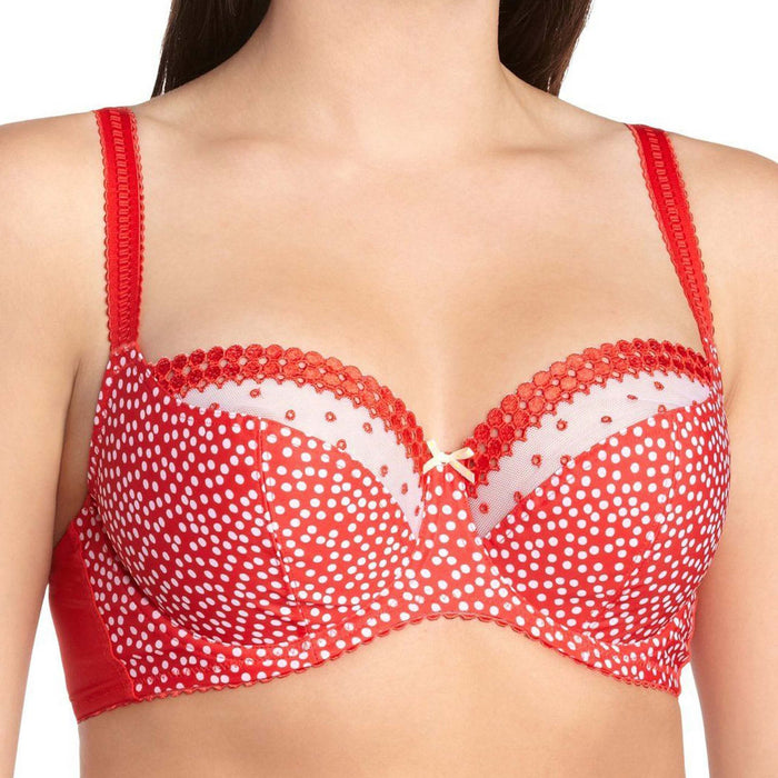 This Cleo balconette bra called Minnie looks almost like a bathing suit top! You'll love the red polka dots and the fun it brings into your bra wardrobe. This unlined, supportive, low cut bra is a great summer bra to wear in ways that give people a sneak peak of it. Color - Red Polka Dots. Style - 7431.