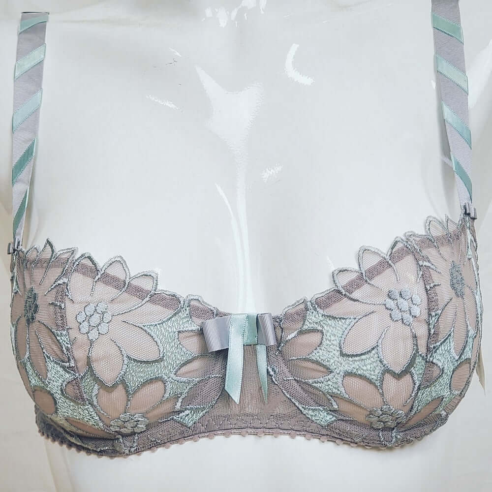 Another hard to find, premium luxury bra. This Aubade bra, Topaz, a demi bra made of great embroidered lace in a gentle taupe color. Great support from a great brand.