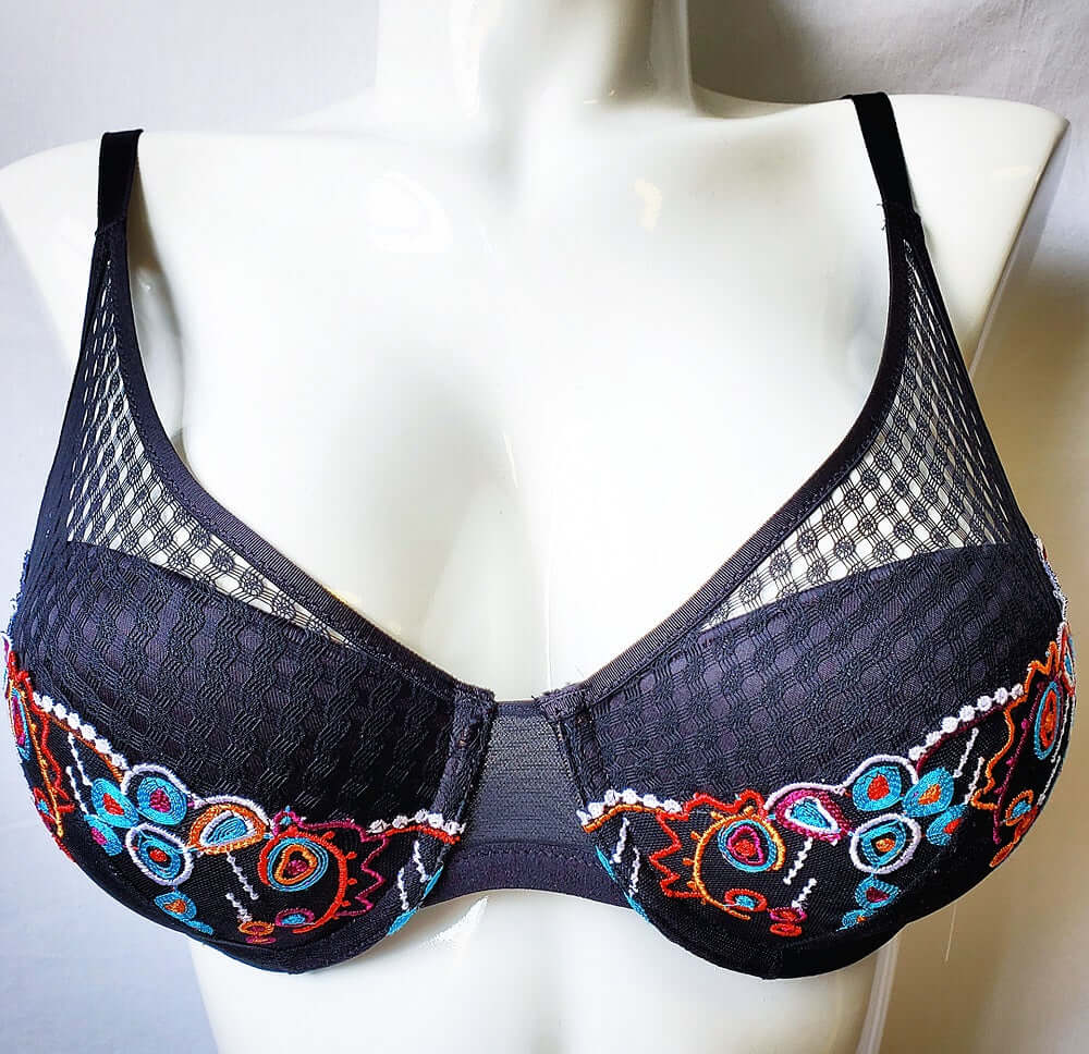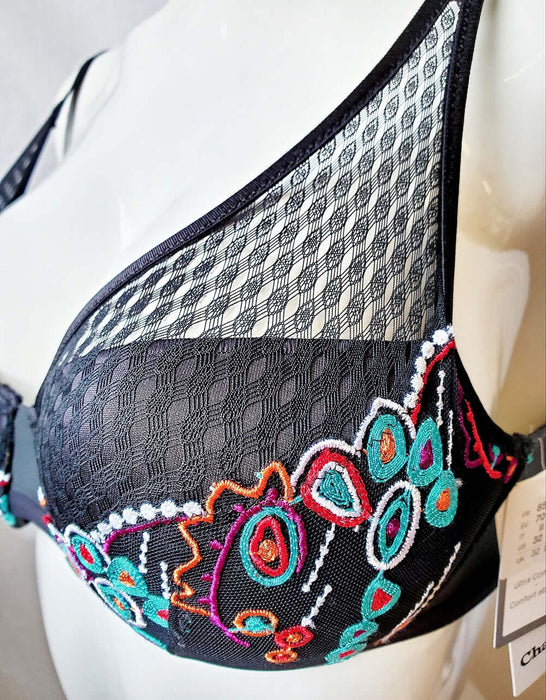 Talk about a hard to find Chantelle bra that has all the styles! From their Montorgueil line, this plunge style Chantelle bra has a motif that seems inspired from South American native art. Padded cups made of a memory foam for an incredible look. The cups are covered in mesh lining. Pair it with black panties for a stunning look. Vibrant yet subdued. Only two sizes of this hard to find Chantelle bra on sale.