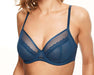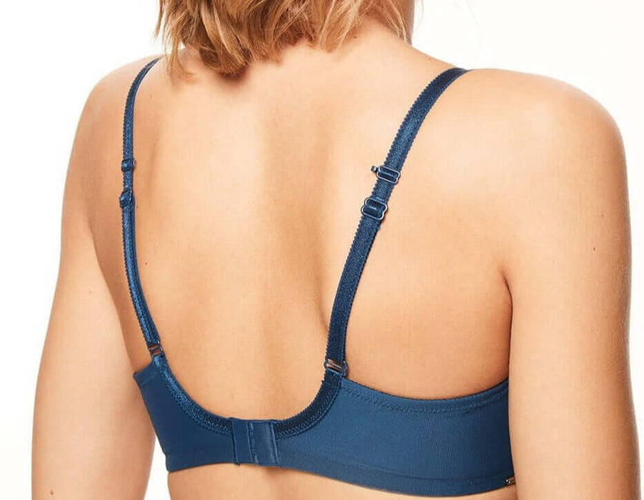A fitter favorite, this Chantelle bra, Parisian Allure with ultra flat seams, low centre plunge, and no padding, is a great go-to bra in your wardrobe. 3-part cups with a fine mesh lining provide superior hold and the vertical and angled seams bring the shape. Side support panels and a j-hook complete this bra's stability. Plus the color is amazing, a rich blue.