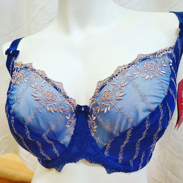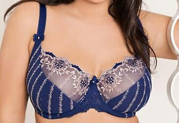 A fun Curvy Kate bra, Emily. This balcony bra with an open neckline, three section cups, wide powermesh wings, and an underwire is ideal for the full bust woman. Made out of a beautiful sheer lace and scalloped edge in a fun, flirty color, this bra is all play. Works great with low cut tops. Plus she is on sale.