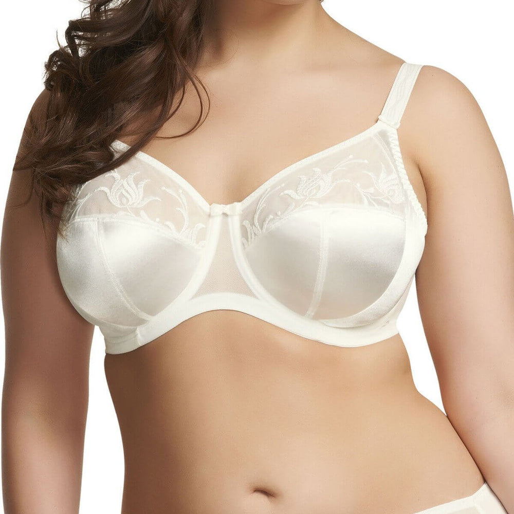 A hard to find Elomi bra, Caitlyn (8030). This plus size bra embodies comfort, support, and coverage. Amazing shape. Amazing lift. Three section cups, side panels, and powermesh sides and back do all the work. A smooth design with sheer top cup panels and Swiss embroidery add the style. Get her while you can, Elomi on sale goes fast.