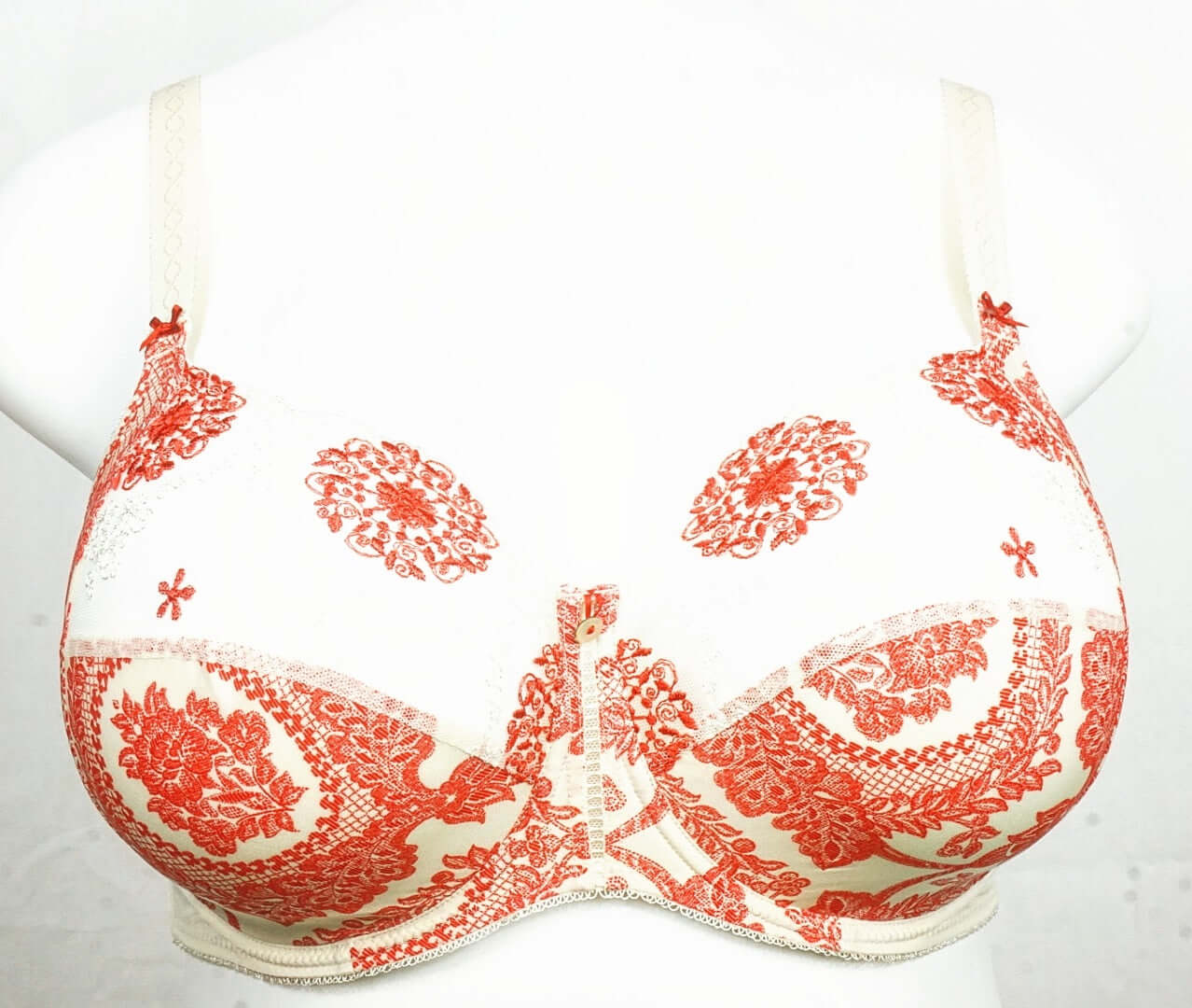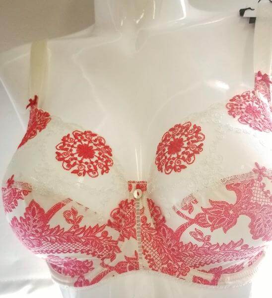 This full cup Empreinte bra is made of three-part cups, provides full coverage and eliminates cleavage with high cut cups. Empreinte offers a natural rounded silhouette with Chantilly lace and a smooth lower panel. Ideal for everyday use. Color Floral. Style 0782.