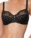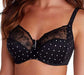 This black with polka dots bra from Empreinte, Maya, is a full cup bra with an underwire, built in side boning and 3-part cups for high class support and fit. Made with a high quality stretch microfibre, this is a bra meant to last. Color - Black. Style - 07157.
