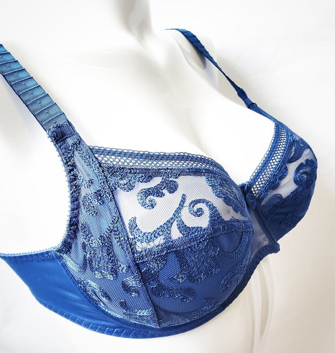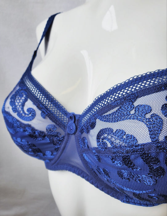 This Empreinte bra, Stella, is a full cup bra ideal for the full bust. Empreinte brings high style and high design to the plus size bra market. Well engineered, the seams on this bra creates a beautiful shape. A not boring bra, this bra is has embroidered swirl motifs on a high-quality tulle. The cups are non-padded. Finished in a wonderful color.