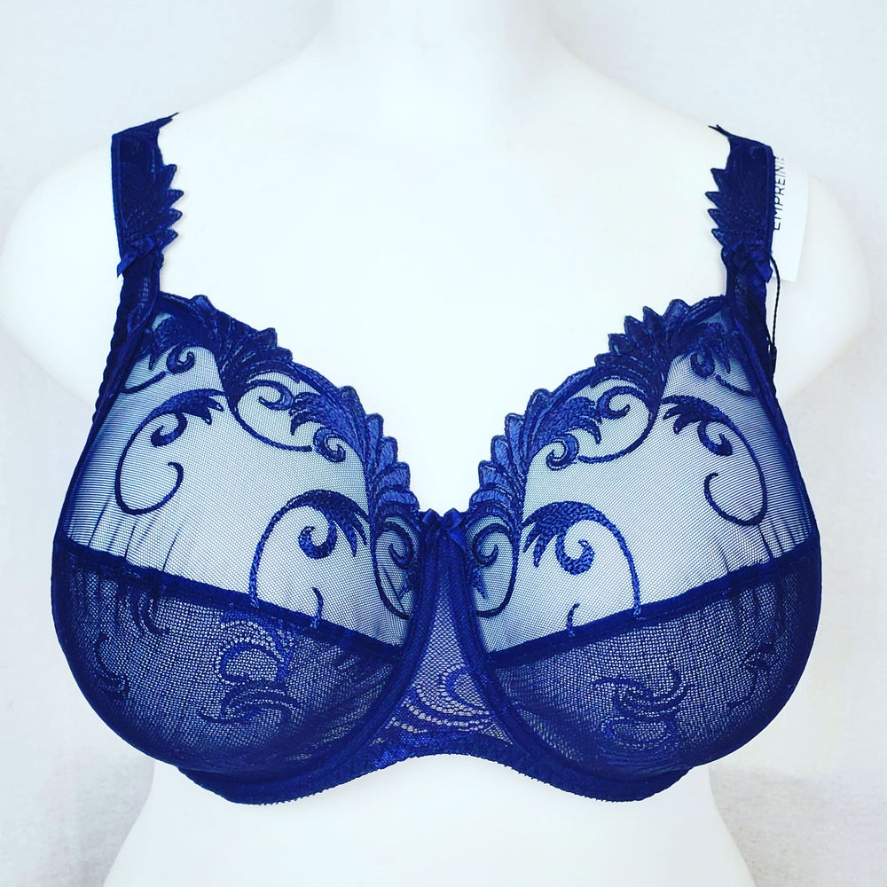 Plus size lingerie at its best, this Empreinte bra gives you the support you need with no blandness. A full cup molded bra with 3-part cups and sheer mesh tulle on the cups and straps for the elegance you deserve. Wide set straps for pressure relief off your neck and shoulders. A premium plus size Empreinte bra at a sale price.