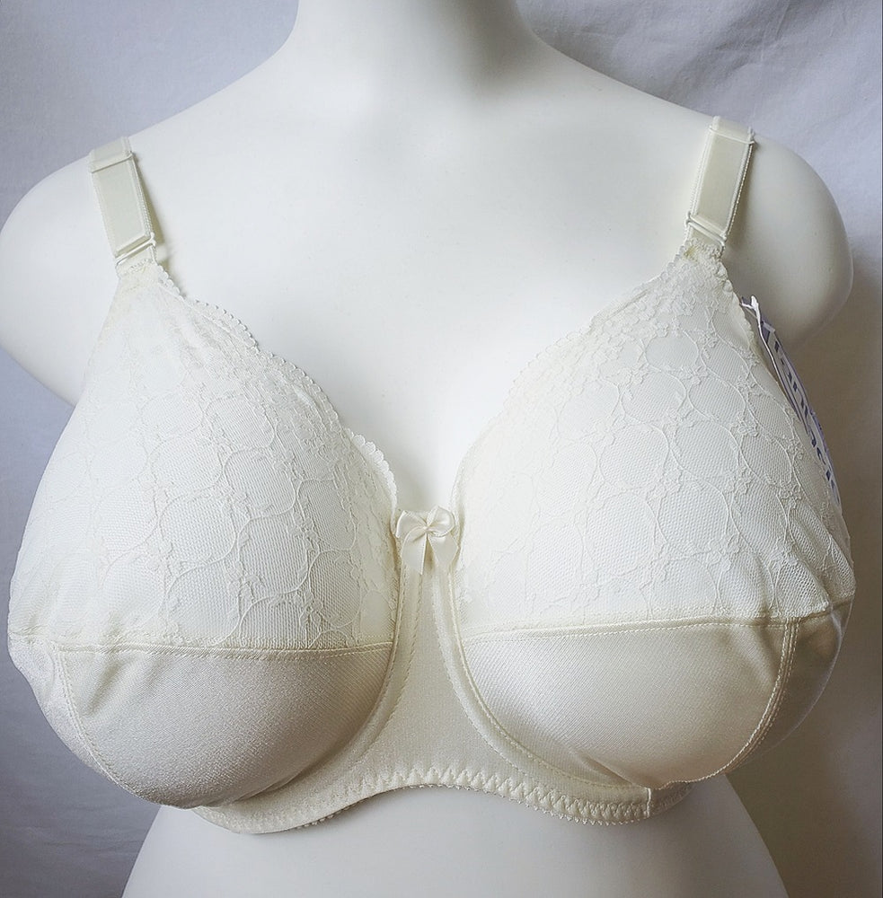 What a beauty find this Fantasie bra is! Impossible to find this bra anywhere. A full cup, lacey bra. Made of a soft fabric this bra is all about comfort, support, and style. Great support and shape from 3-part cups. Upper half of the cup is made of a delectable lace. Unpadded cups.