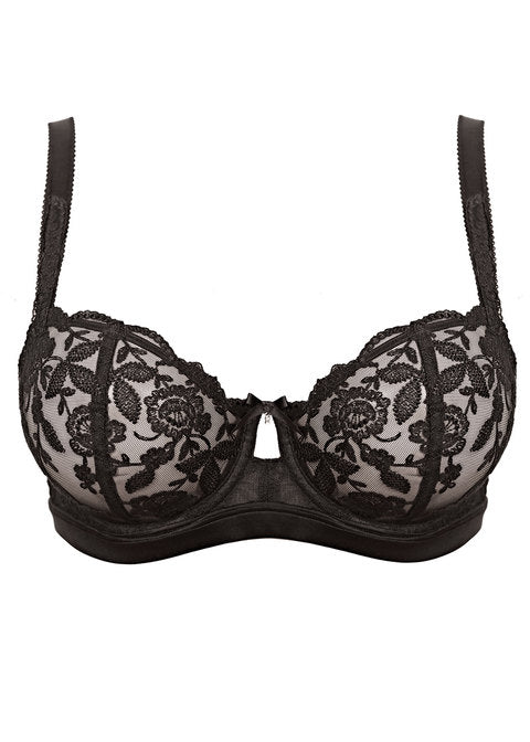 A loved bra by Fantasie, this bra has seamed, two section cups. Vertical seaming creates cleavage and the inner side support sling provides extra support. Cups are adorned with Swiss designed corded embroidery.