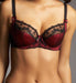 The gorgeous Fauve bra, Celine, features an opulent antique base with striking Swiss embroidery and tulle in contrasting jet black. Lower centre panel gives an enticing plunge effect. Color Dark Red. Style 0112.