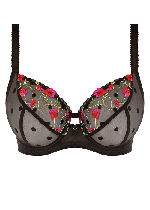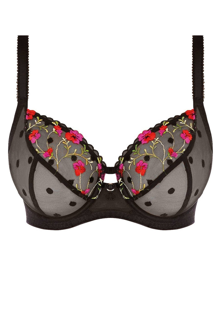 Freya Awakening, is a plunge bra made of see through mesh with a keyhole detail and great, colorful, floral embroidery.