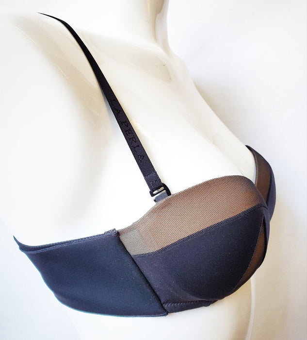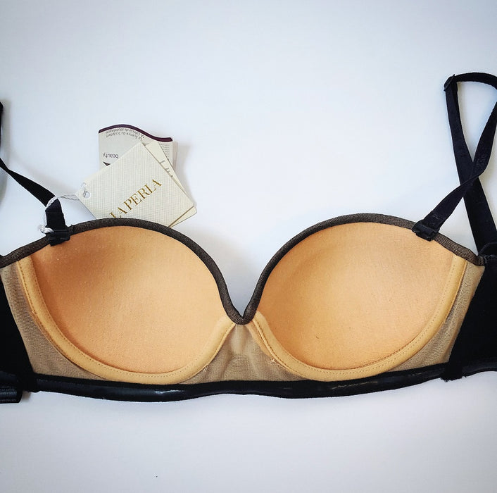 A high class strapless La Perla bra, and at this sale price, it won't get any better. Scuba, a bandeau style bra with silicone inner gripping to make sure it stays in place. Don't want it strapless? Just wear it with the straps. The pushup cups will give you an incredible shape and lift your bust for excellent cleavage. Mesh paneling and a wonderful design. From the Italian masters. Color Black. Style 906220.