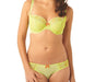 This seamed, 3-part cup balcony bra is designed for everyday wear. Sheer, embroidered tulle along top half of cups adds a sexy touch. Cups are lined at bottom for extra support. Sides and back are made of powermesh for a secure fit, and have elastic along edges. Center panel is arched for high tummy comfort, with satin bow. UK/US Size. Color - Yellow. Style 5851.