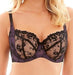 This fashion Panache bra, Lois, in a balconette style is now discontinued, so if we have her in your size, buy her and run! Plus she's on sale. A feminine and sophisticated bra, the cups are see through, with floral embroidery, and no padding or lining. An underwire and side support panels give you the necessary support. It's rich Black\Purple color makes it easy to pair with a solid color panty.