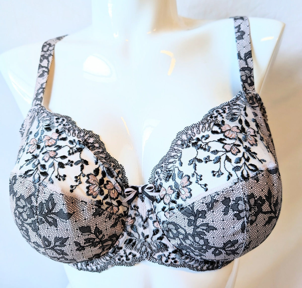 The Prima Donna Gythia full cup bra with a burlesque look and a touch of feminine charm. The black floral print on a soft pink background is perfect mix.
