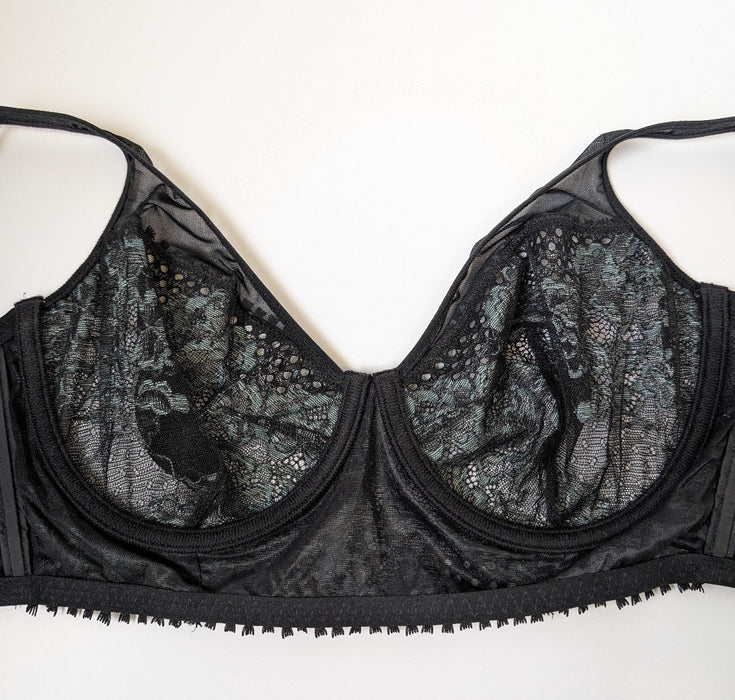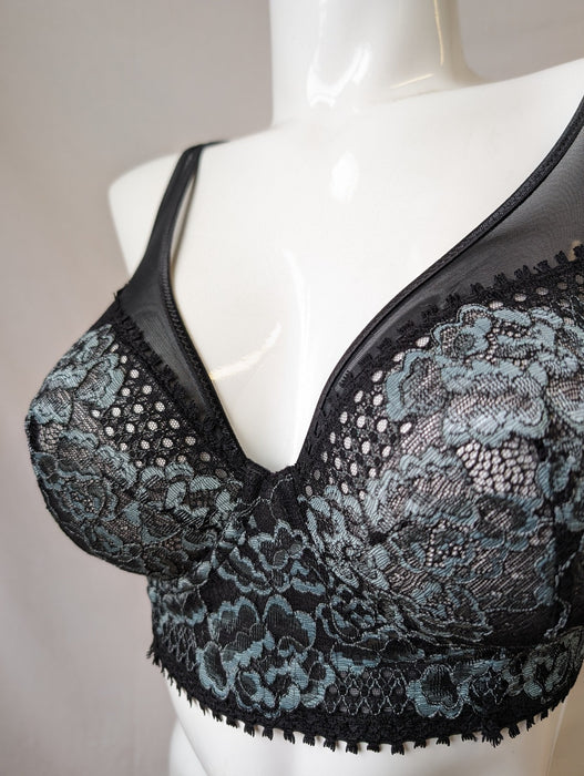 The lower cut cups enhance your cleavage, skillfully designed to flatter. Crafted from delicate lace and adorned with tulle-lined cups that continue onto the straps, this non-padded, underwired bra provides remarkable support, lifting your bust to achieve the perfect fit.