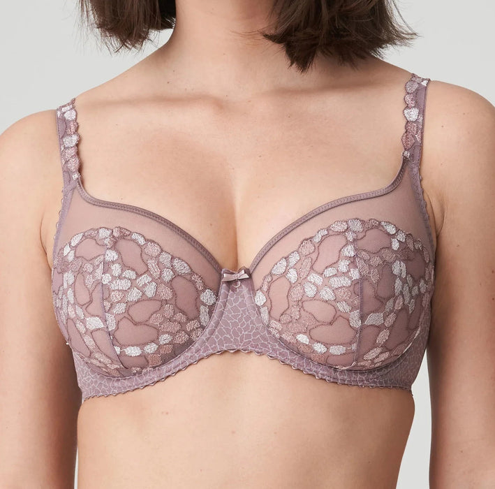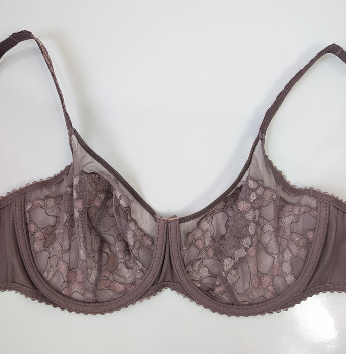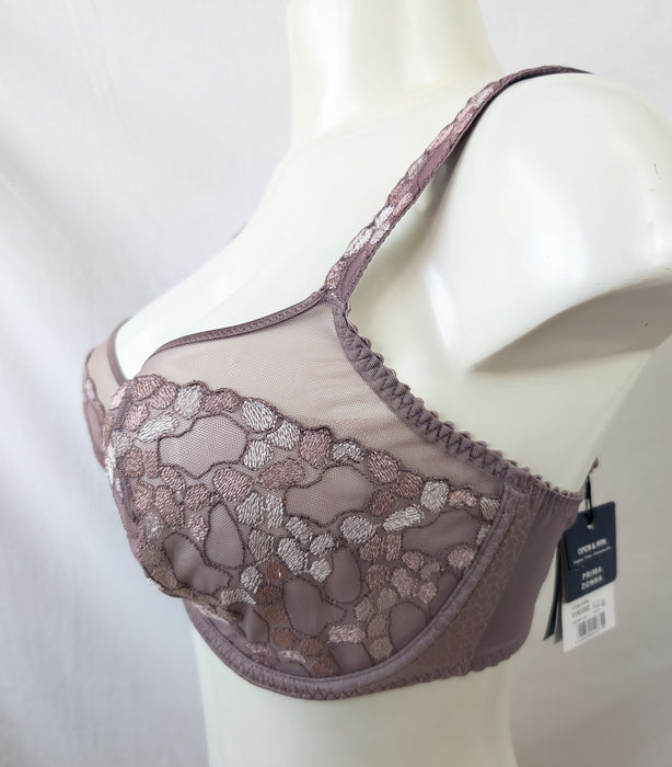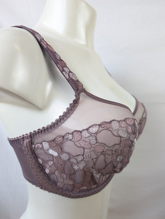 Elevate allure with this sheer embroidered Prima Donna bra. The Hyde Park balcony bra has multi-part, underwire cups, made with unattached razor-cut mesh. Center panel has a goldtone charm.