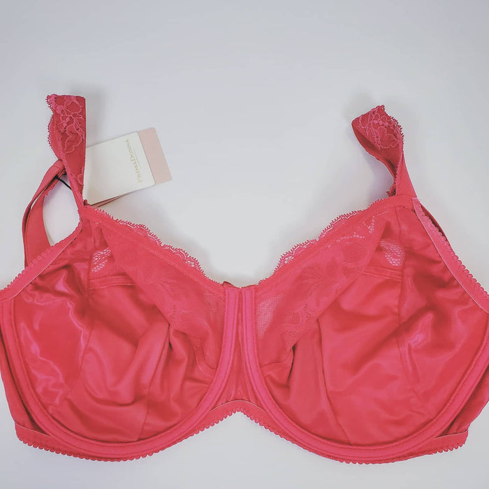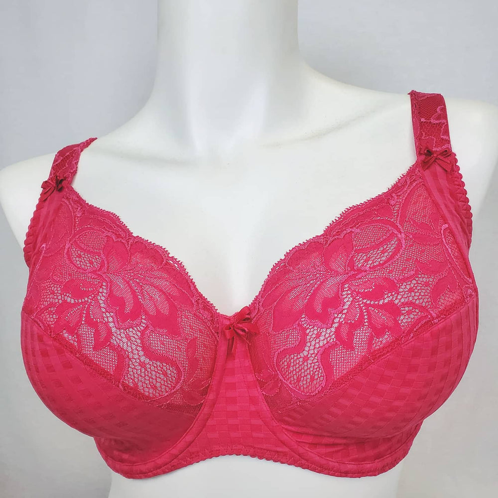 This Prima Donna bra, Madison, is ideal for women with full breasts or extra breast tissue. The bra has deep cups to accommodate volume that would end up under your arms. Lined side support panels prevent side spill. The stretch leavers lace along the top of the cups helps create the perfect fit by forming to your breasts. Color Framboise. Style 0162121.