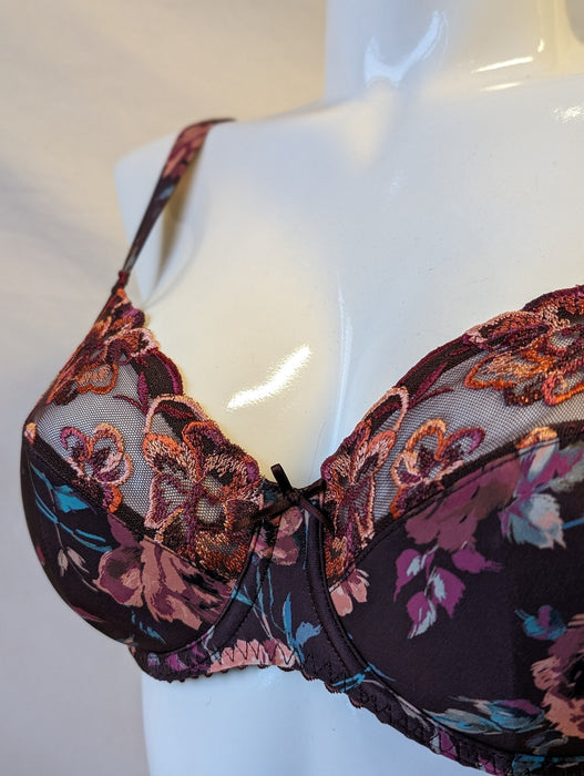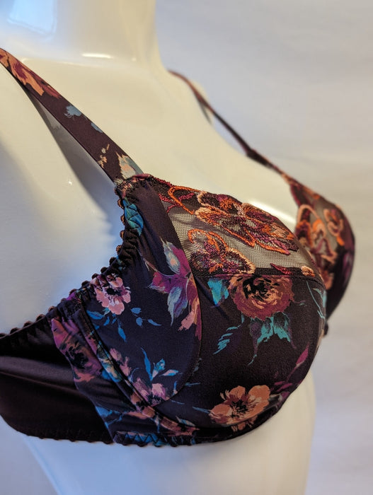 Made of a blend of polyamide (nylon), elastane, and polyester, this multi-part underwire cup bra features mesh lining to shape and support. The microfiber cups have colorfully embroidered, sheer mesh panels at the top with floral print at the bottom. The top edge of the cup has sewn-on elastic to keep the fit in place.