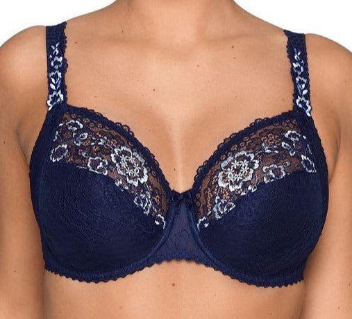 Prima Donna True Romance Bra Underwire Full Cup Style 0162841. This super supportive bra for the full bust designed to be strong and firm yet light and airy with ultra-fine lace. A partial cotton lining provides comfort and modesty, adjustable wide straps are decorative with an embroidered chain of flowers, and side support panels create a forward facing profile. Color - Sapphire. UK SIZE. Style - 0162841.