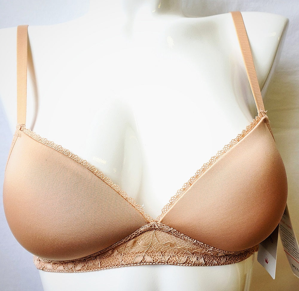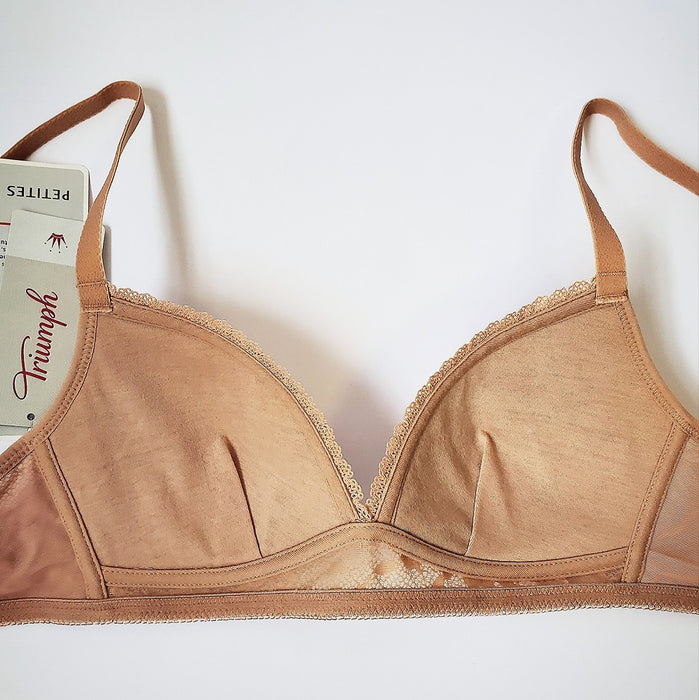 For the petite lady. This Triumph bra weaves comfort and style. A wireless bra (hello comfort!) in a tshirt style gives you a great smooth, rounded shape. Plunge cups make it a great option for low cut tops and dresses. Super soft fabric. The cups are lined with a delicate cotton. The band has a delicate, sophisticated lace. This Triumph bra is a great everyday bra in a bralette style. Plus it's on sale.