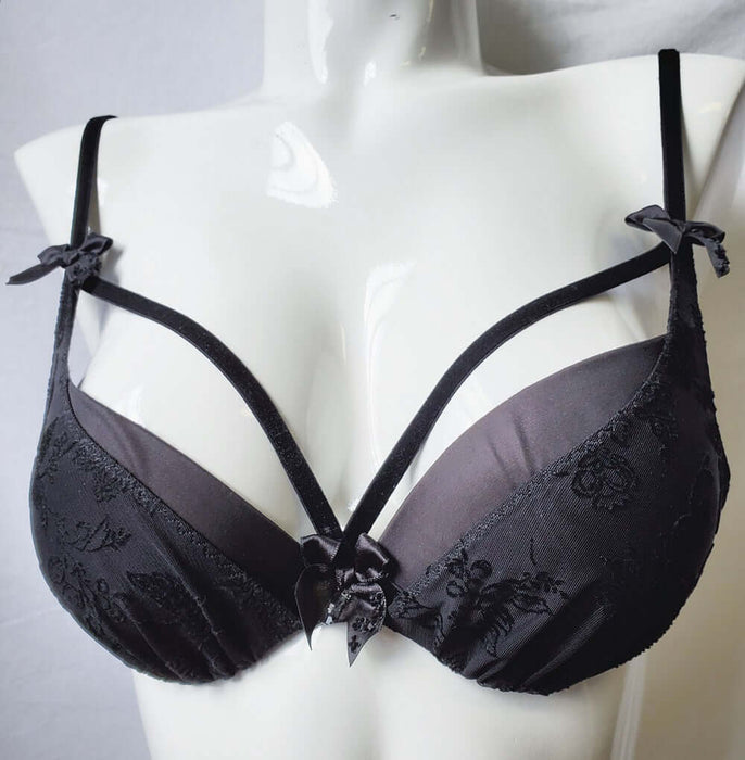 This Aubade bra, a molded plunge bra, gives you an incredible shape and look. Want to show some cleavage, this bra gives you a great look and uses straps across the top of your bust to frame it. The cups are adorned with a velvet tulle with an elegant floral motif. In a classic black color it is easy to pair with black panties for a set. A hard to find Aubade bra on sale.